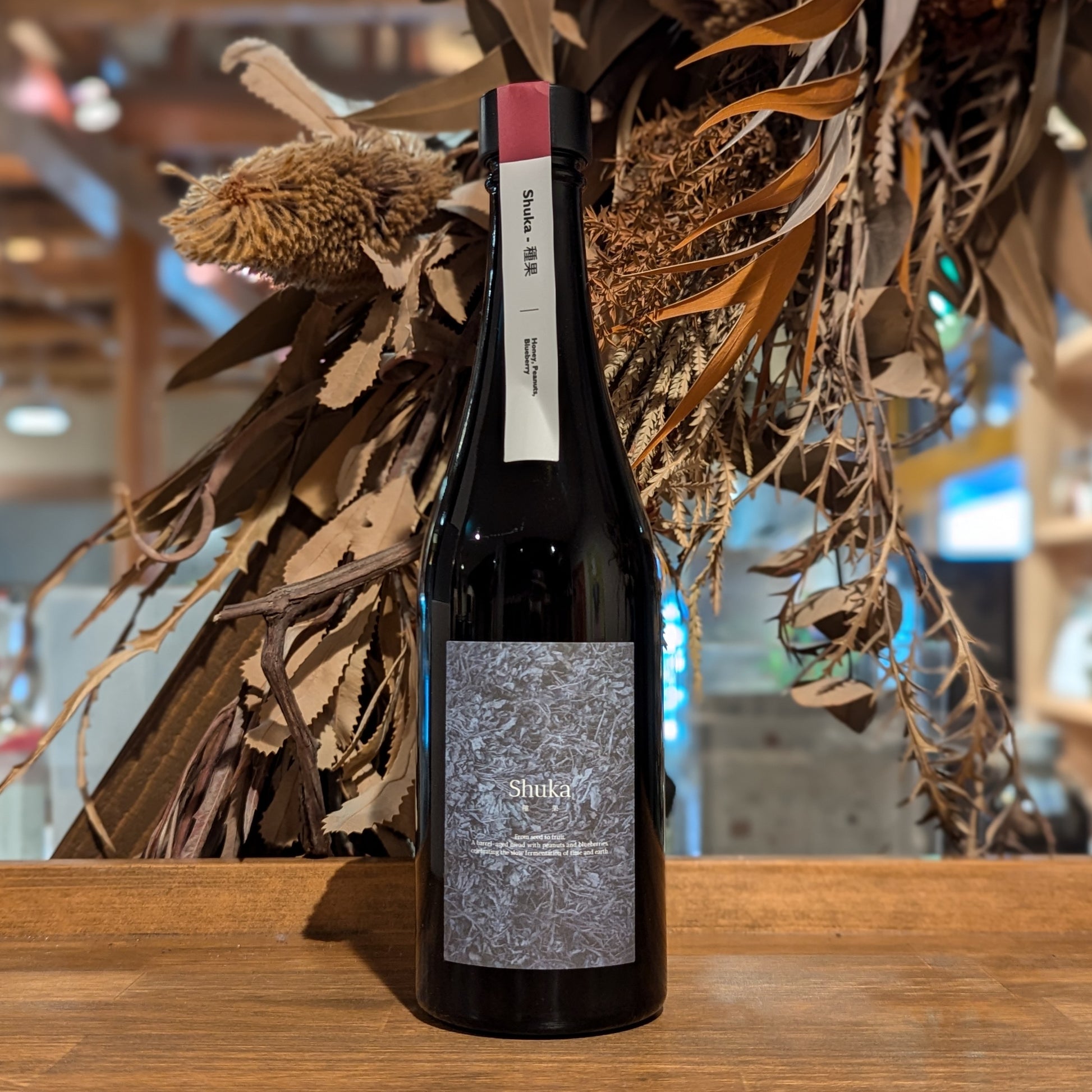 「種果(Shuka)」は、千葉・Bocchiさんの落花生と野洲・久美子さんの無農薬ブルーベリーを使用し、ワイン樽で半年間熟成させたミードです。